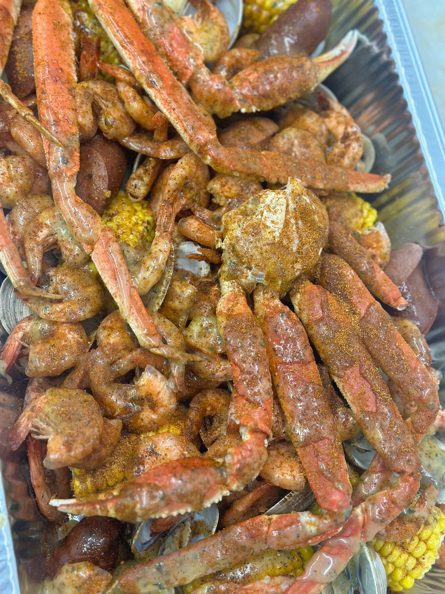 All trays include: corn cobettes, baby red potatoes, Carolina Pride smoked sausage, garlic butter drizzle, and a jar of cocktail sauce.